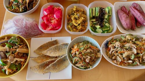 ↑↑ 【 メニュー 】 豚肉となすびとピーマン、きのこの炒めもの。 アジフライ。(多めの油で焼いたもの。) ゴーヤーチャンプルー。 紫玉ねぎの塩もみしたもの。 トマト。 かぼちゃとレーズンのサラダ。 きゅうりに鶏がらスープの素と塩こんぶ、ごまを塗した…